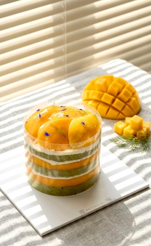 蛋糕靈感嚟自泰國芒果糯米飯。斑蘭蛋糕體,椰香麻糬,夾層有原片新鮮芒果肉,海鹽奶油提味。減糖配方,鹹甜平衡,每一啖都食到芒果,啱晒唔鍾意食甜嘅你。